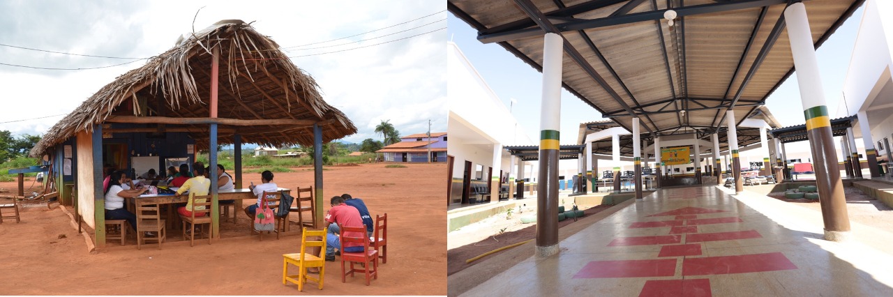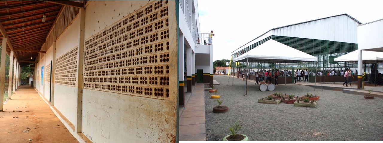 Antes, as estruturas das salas de aula eram de palha e madeira. Não havia ventilação e as crianças sofriam com o calor. Com a mudança, as oito unidades ganharam paredes de alvenaria, salas climatizadas, parque e até uma quadra de esporte coberta.