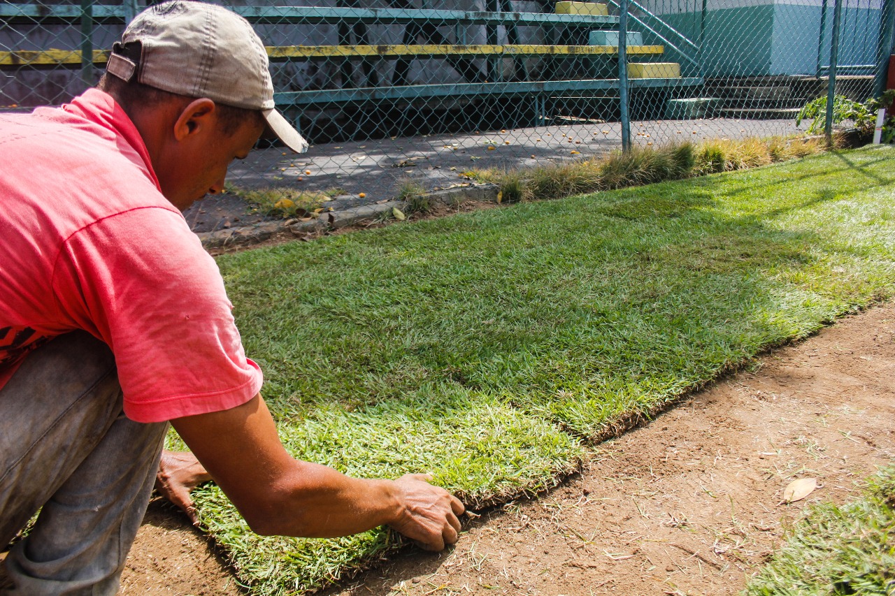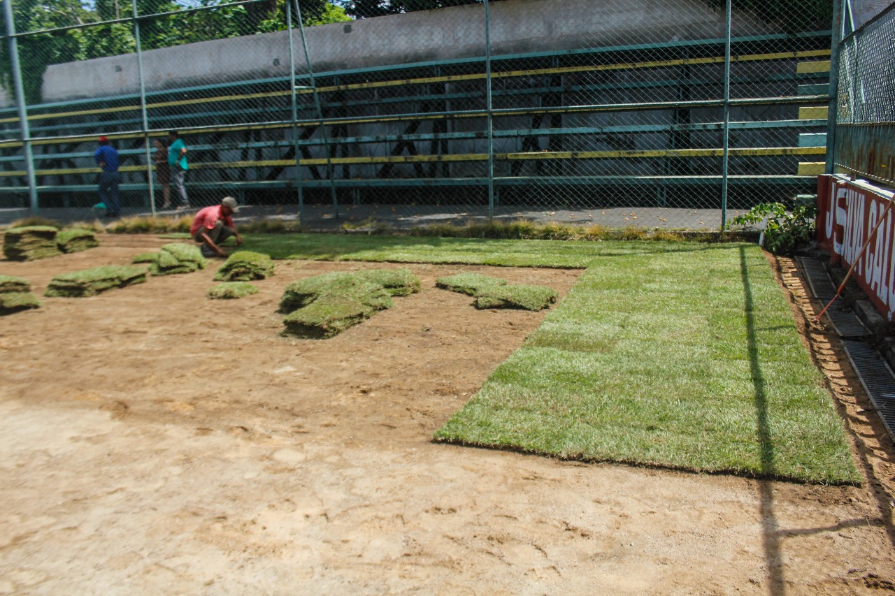 De acordo com o Engenheiro responsável pela obra do estádio, Jadson Aguirra, após alguns contratempos finalmente a grama começou a ser entregue e a colocação foi iniciada imediatamente. “Nós já estávamos com o terreno preparado para receber a grama, já tínhamos preparado terra, para ajudar no enraizamento dos blocos de grama, assim como feito a adubação e aplicação de herbicida. Agora o processo é de plantio, que deve levar pelo menos uns quatro dias, com as equipes trabalhando, inclusive no final de semana”, disse Jadson.