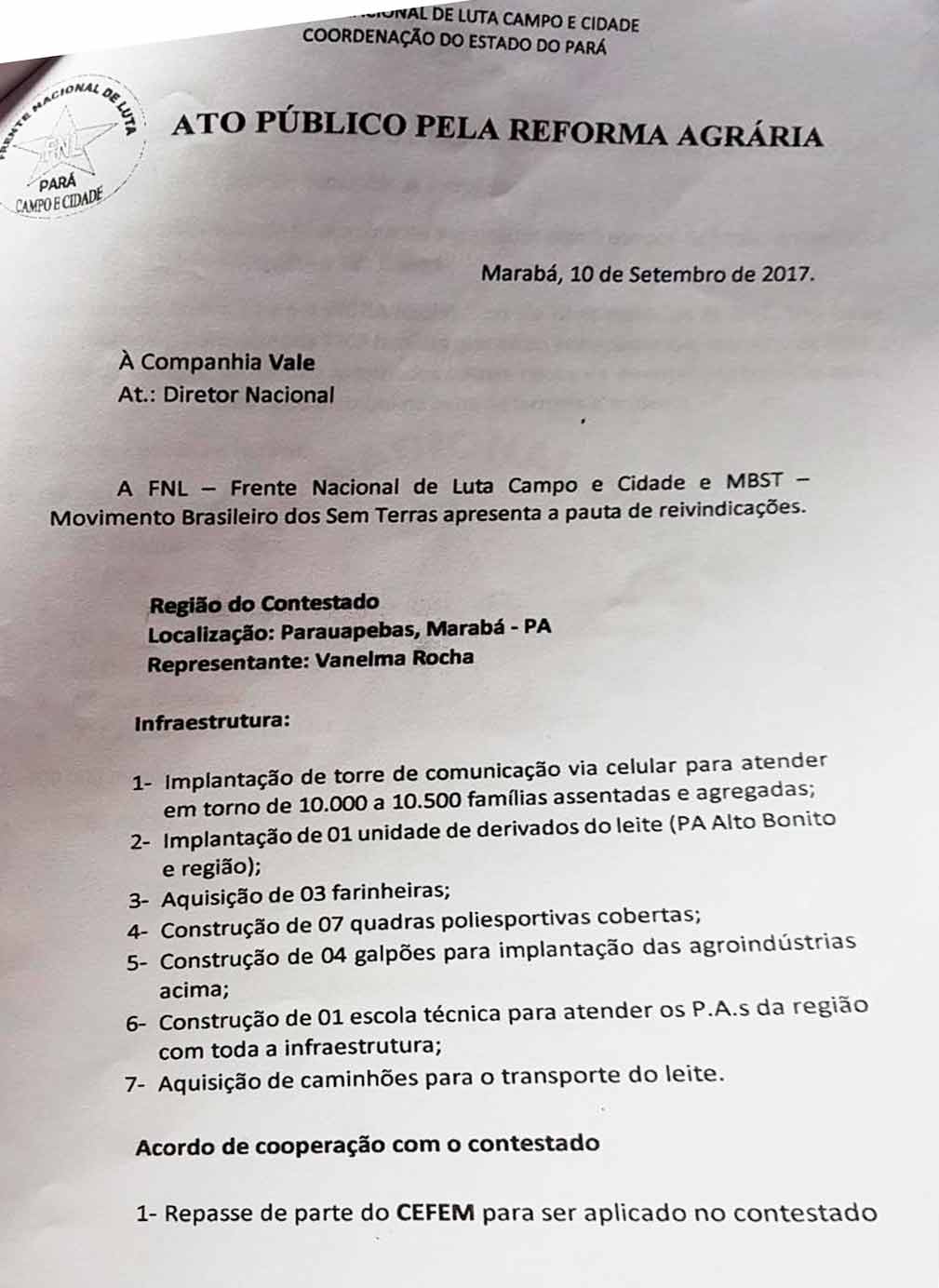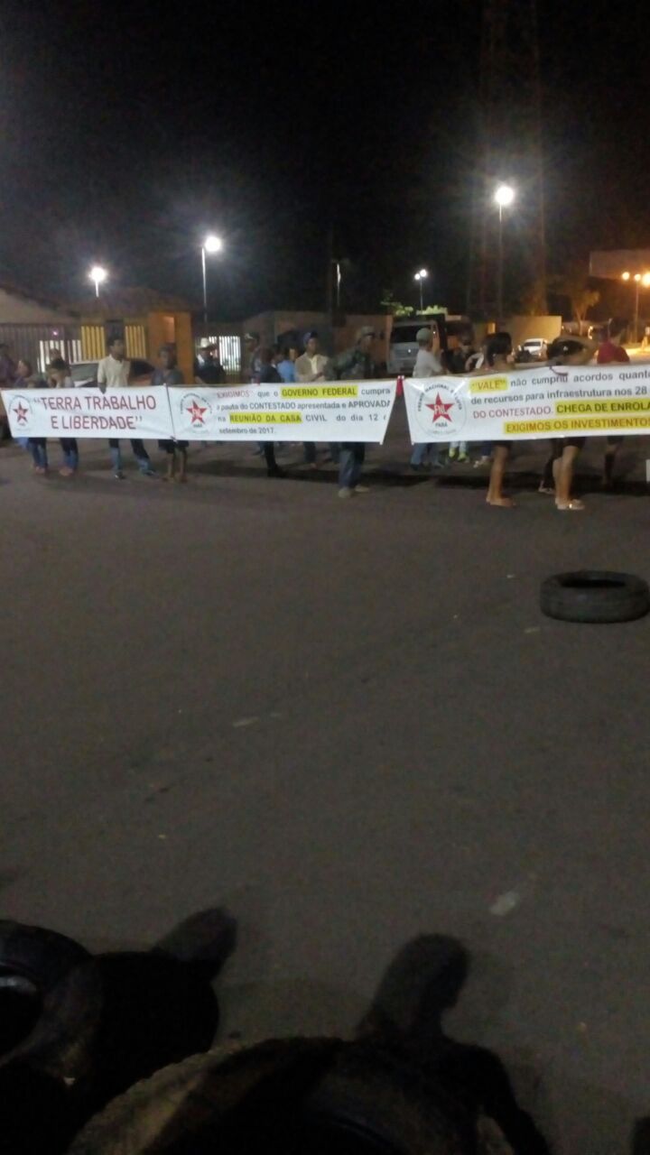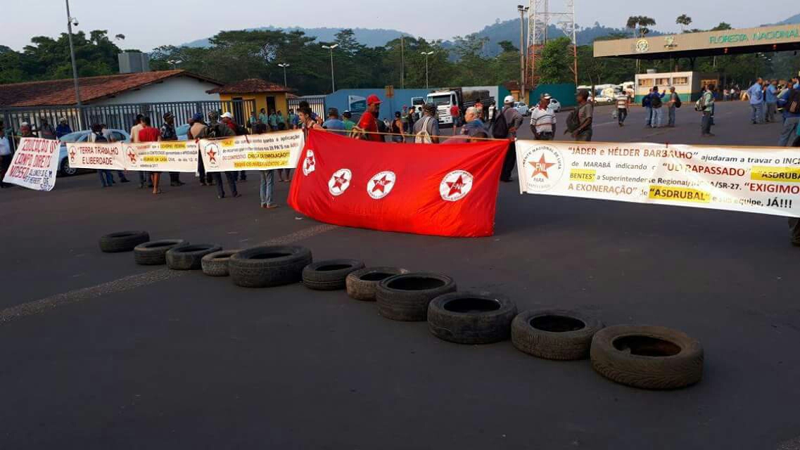 Com uma pauta extensa de reivindicações feitas a Vale, o Movimento Brasileiro dos Sem Terra (MBST), por meio da Frente Nacional de Luta Campo e Cidade (FNL), interdita desde as primeiras horas desta segunda-feira (27), a Portaria que dá acesso a Floresta Nacional de Carajás (FLONACA), a Rodovia Faruk Salmen (próximo ao Parque de Exposições) e a Estrada de Ferro Carajás, no Km 854.