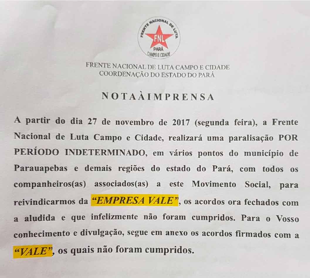 João explica ainda que a negociação deverá ser feita via Brasília. Portanto, não há uma previsão para liberação dos espaços ocupados pela FNL. “Aqui, o pessoal da Vale de Carajás não vai resolver nada. Essa negociação deve ser feita via Brasília. É uma coisa simples, social”, esclareceu.